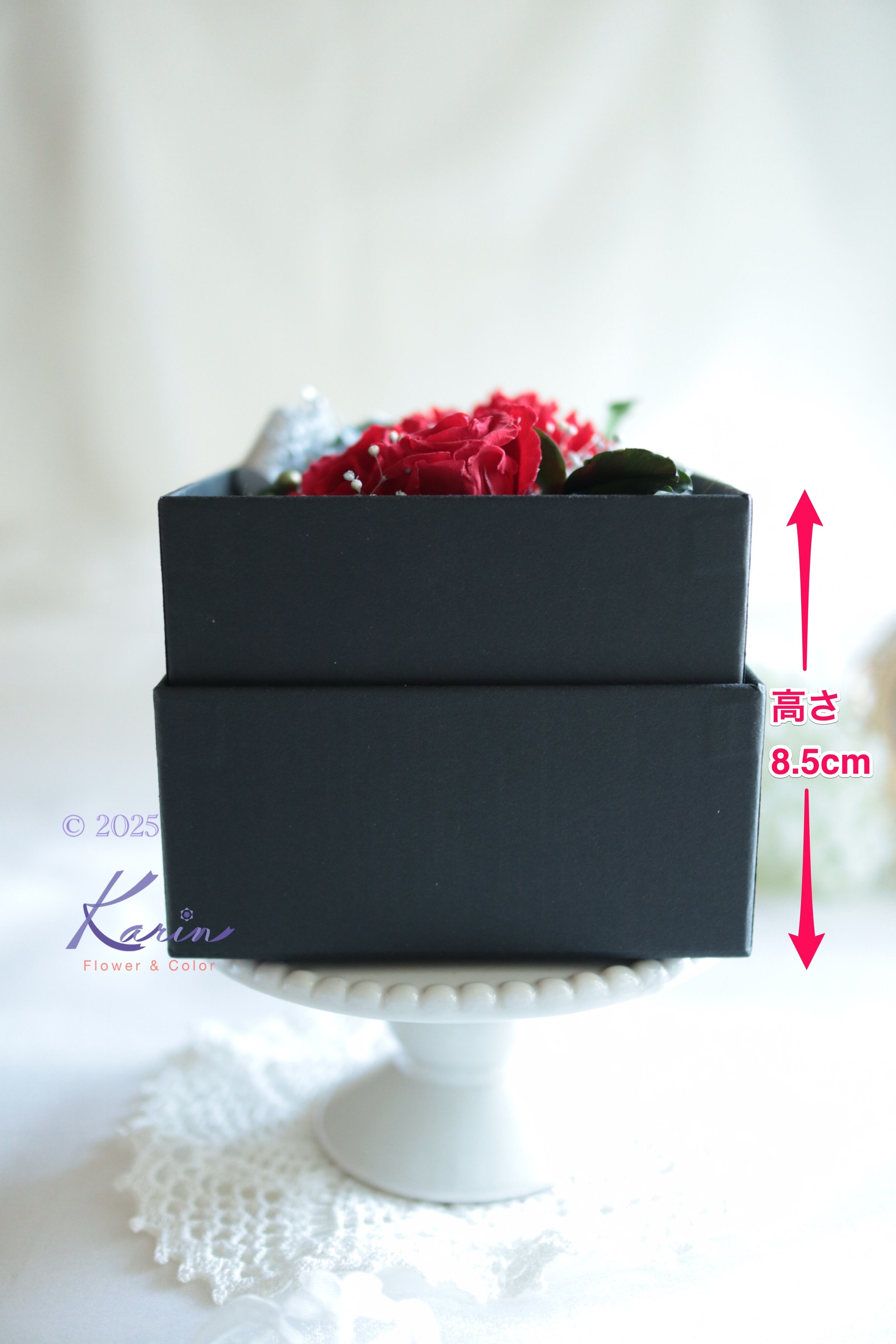 蓋を開けると真紅のアレンジメントが現れます。