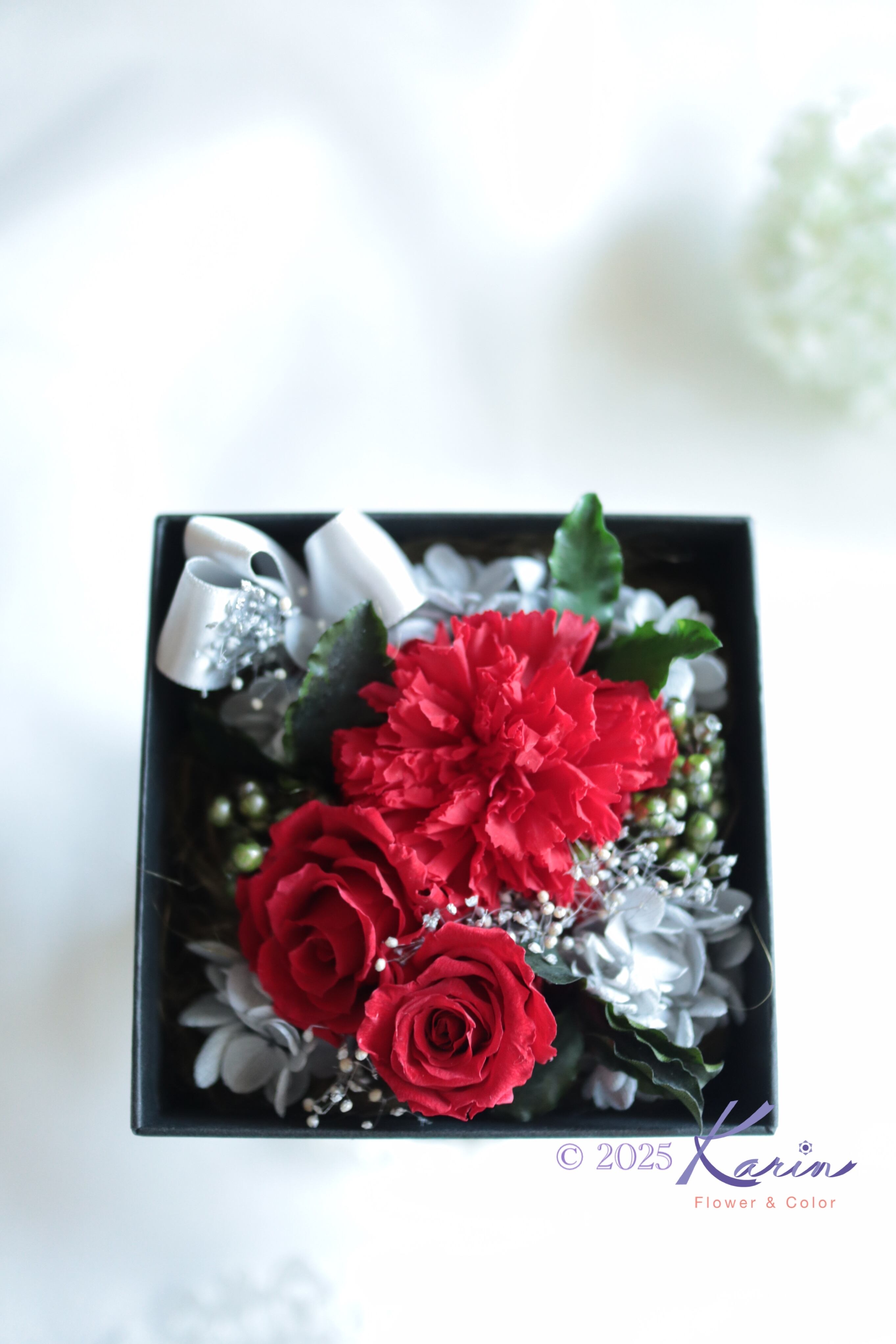 赤を引き立てるために、シルバーのリボンと淡いグレイのアジサイなどで調和をとりました。