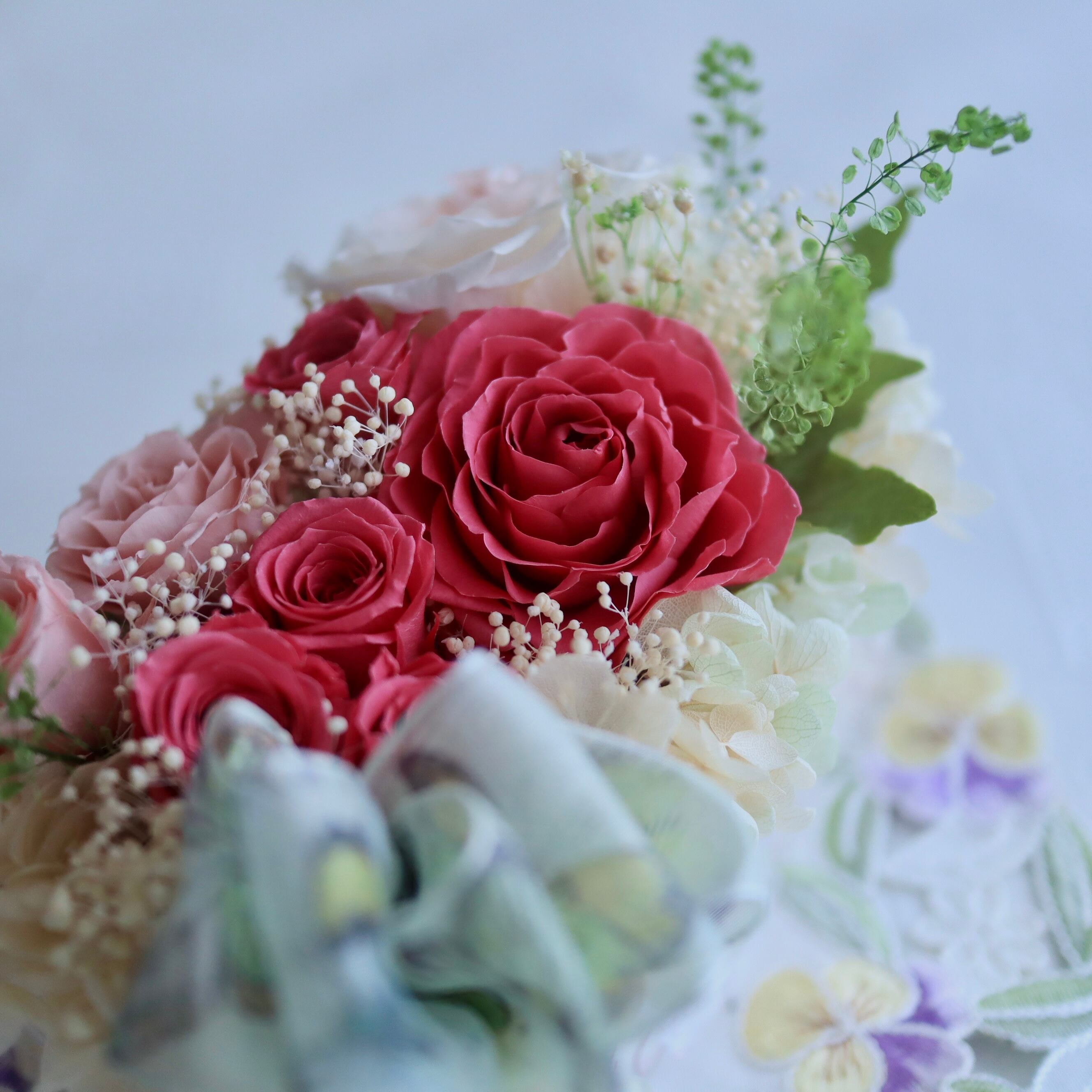 【花材】大輪バラ・ミニバラ・アジサイ・カスミソウ・アイビーリーフ・ペティーコート→全てプリザーブド加工されたもの。