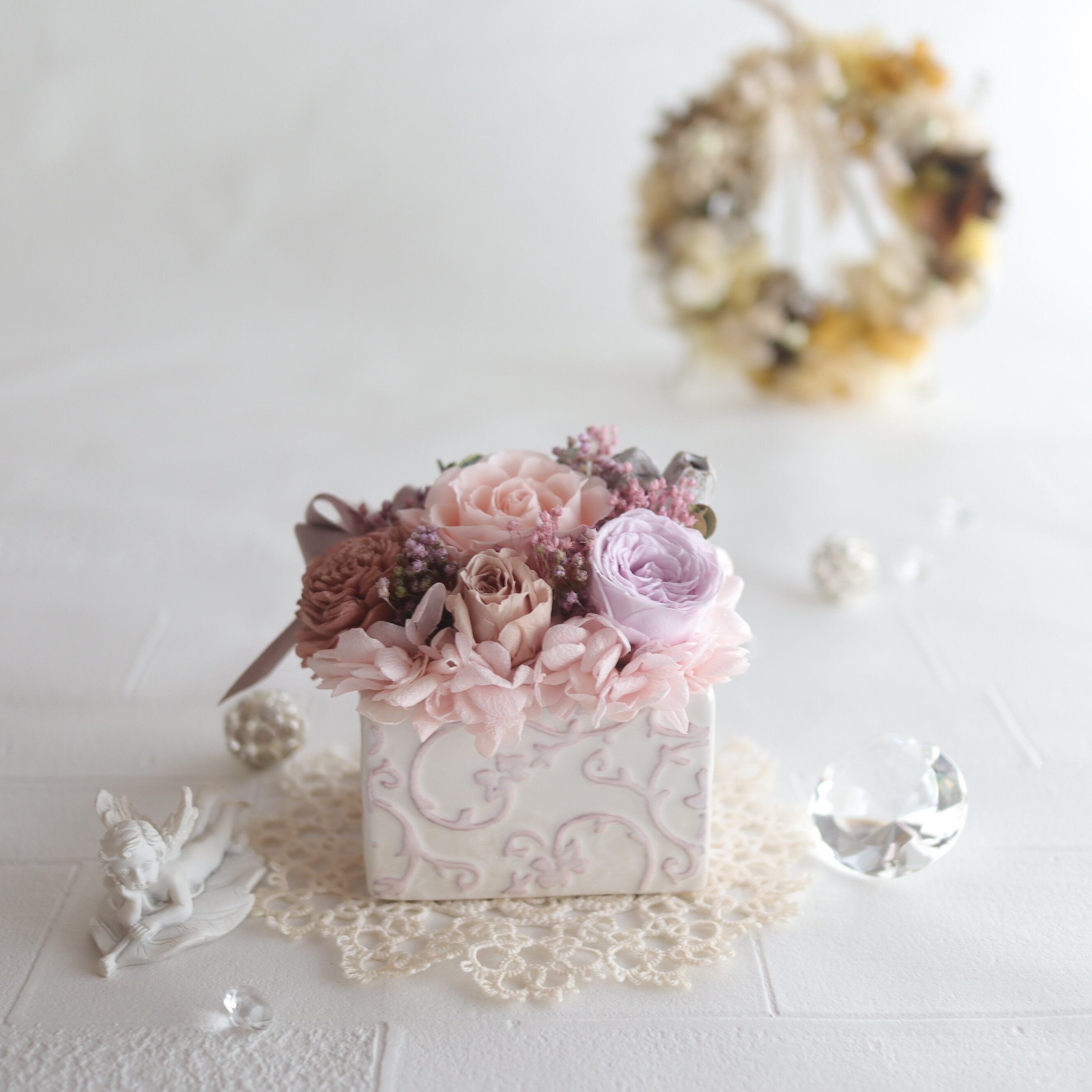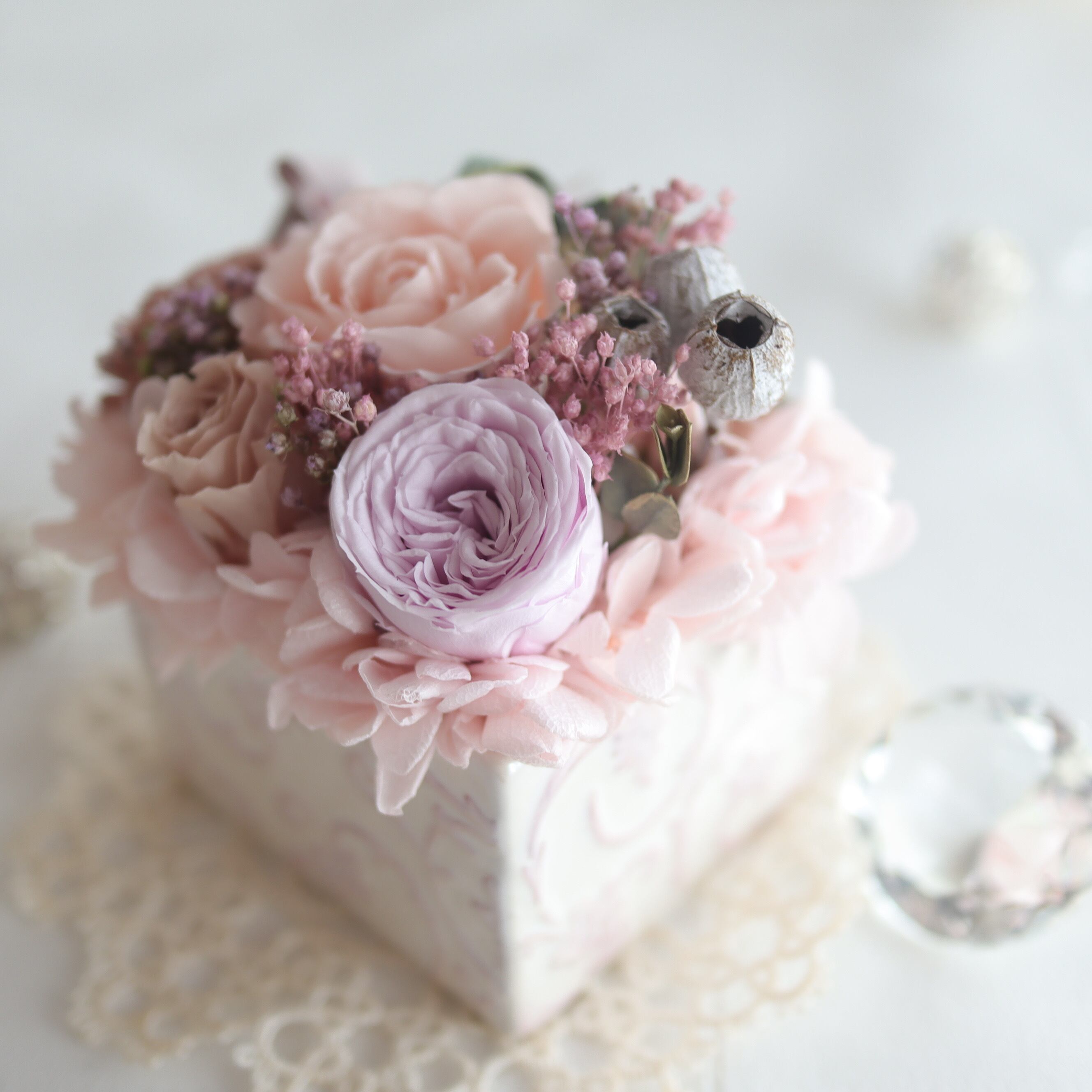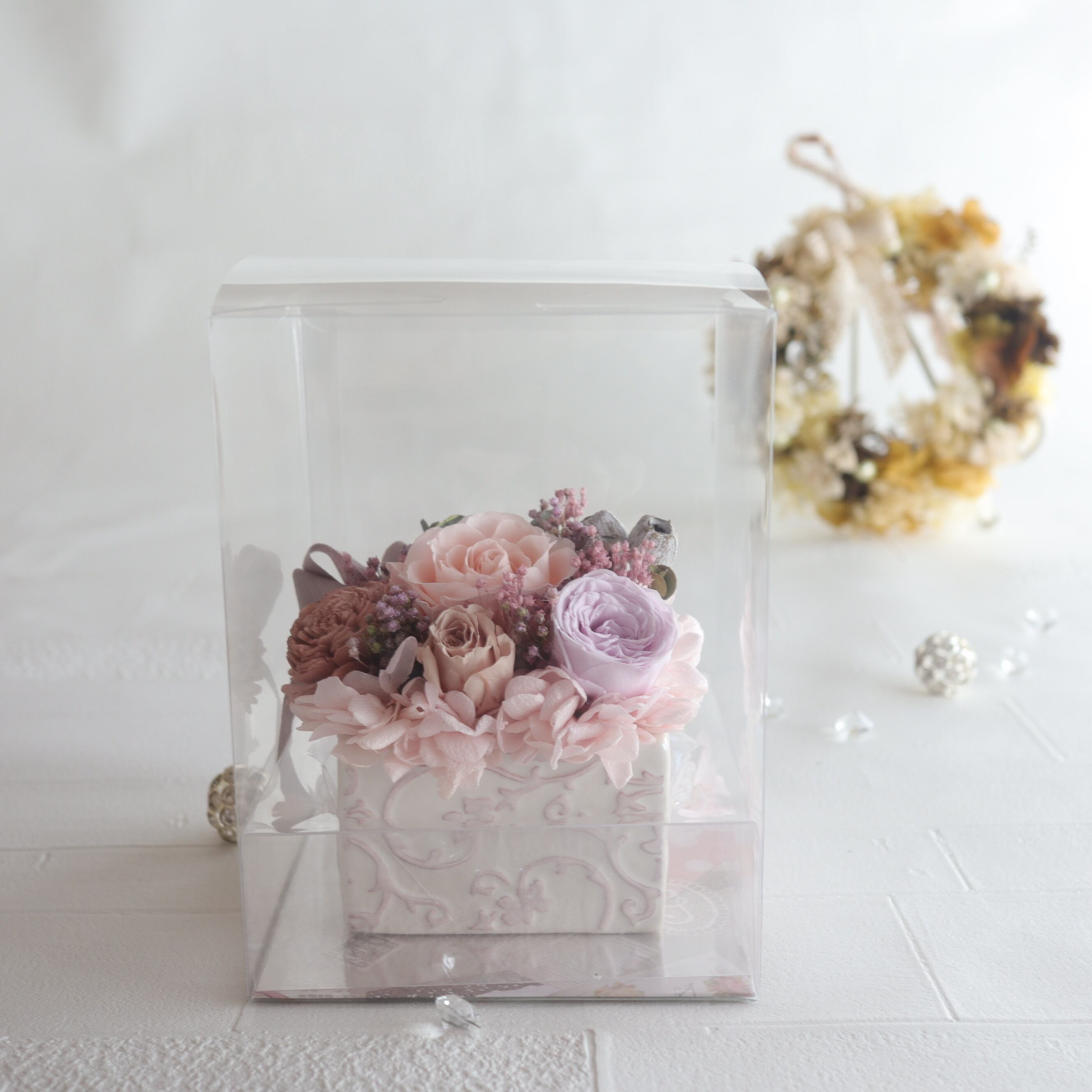 ・プリザーブドフラワーは非常にデリケートですので、お取り扱いには十分ご注意ください。