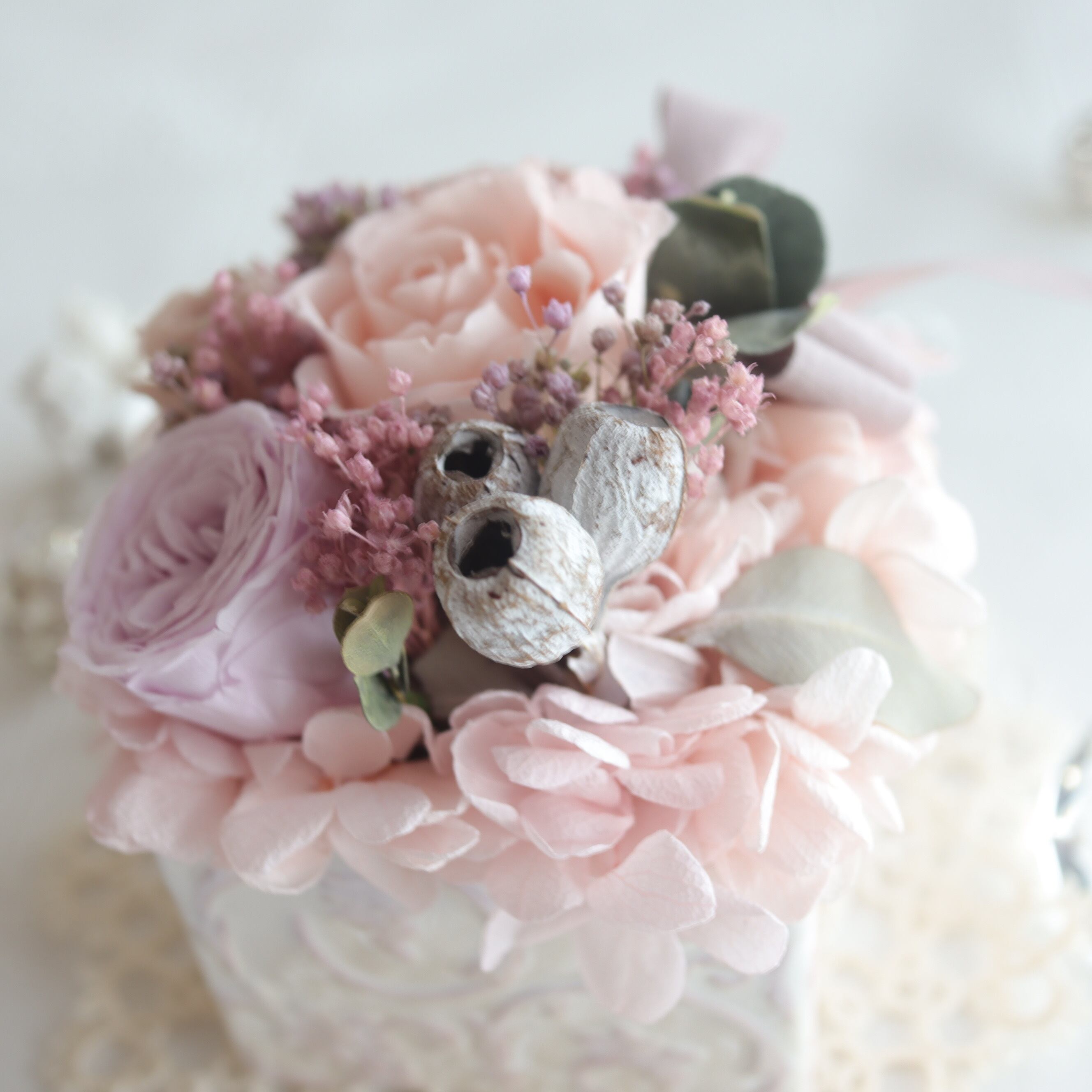 【花材】ミニバラ・アジサイ・モリソニア・ユーカリリーフ・ブルーマリー→プリザーブド加工製品