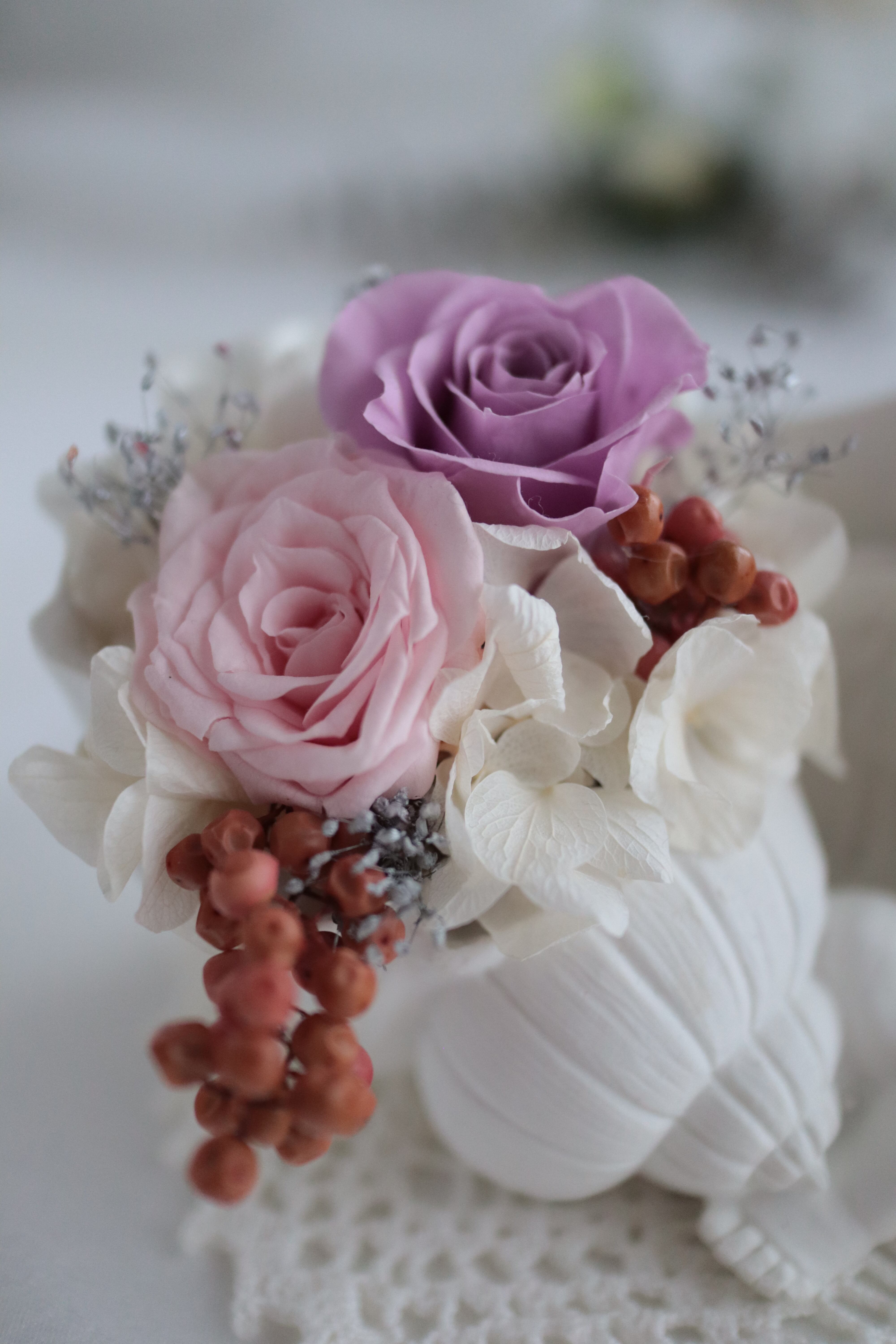 【花材】バラ・アジサイ・カスミソウ・ペッパーベリー→全てプリザーブドフラワー